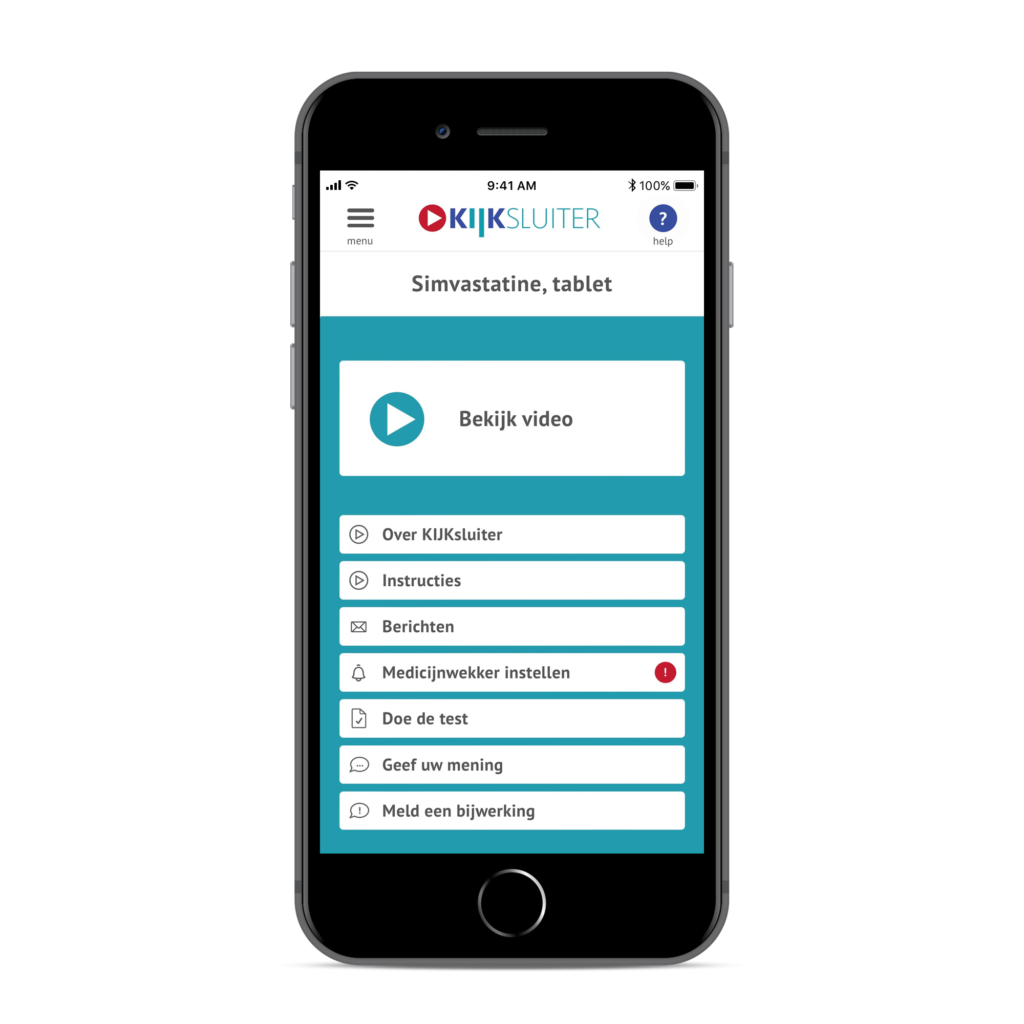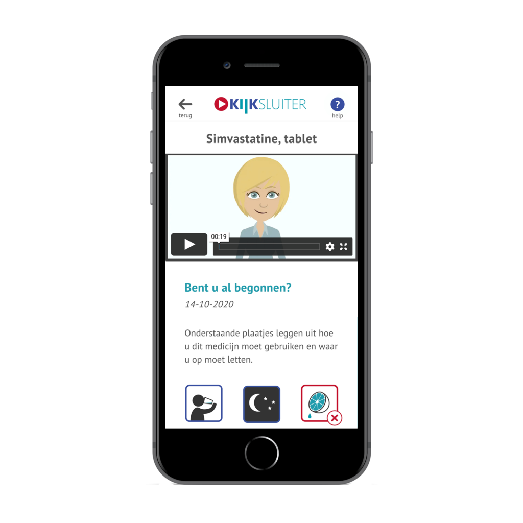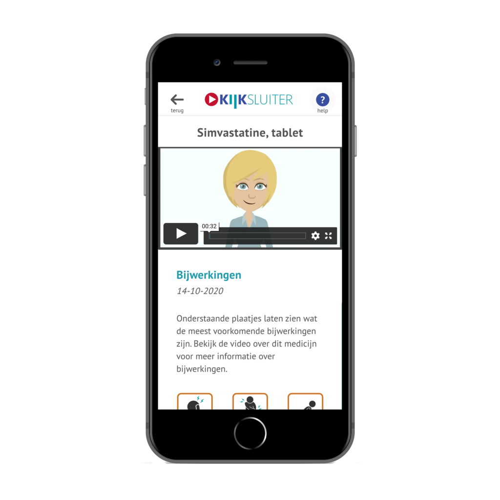 Bij het openen van KIJKsluiter (via e-mail of QR-code) krijgen patiënten een ‘dashboard’ met plaatjes te zien. Het dashboard toont alle beschikbare informatie voor het betreffende medicijn in de gekozen taal, waaronder de instructievideo. Patiënten bepalen zelf wat ze willen bekijken: