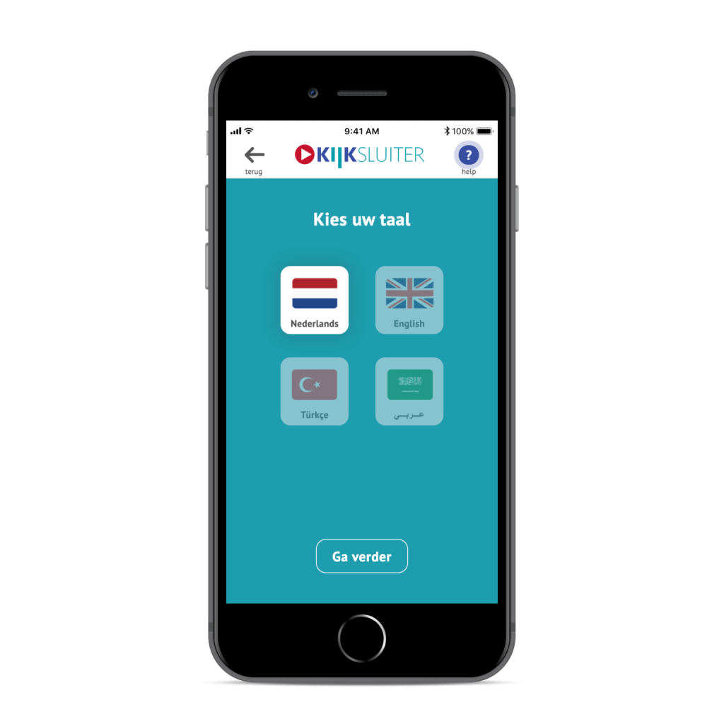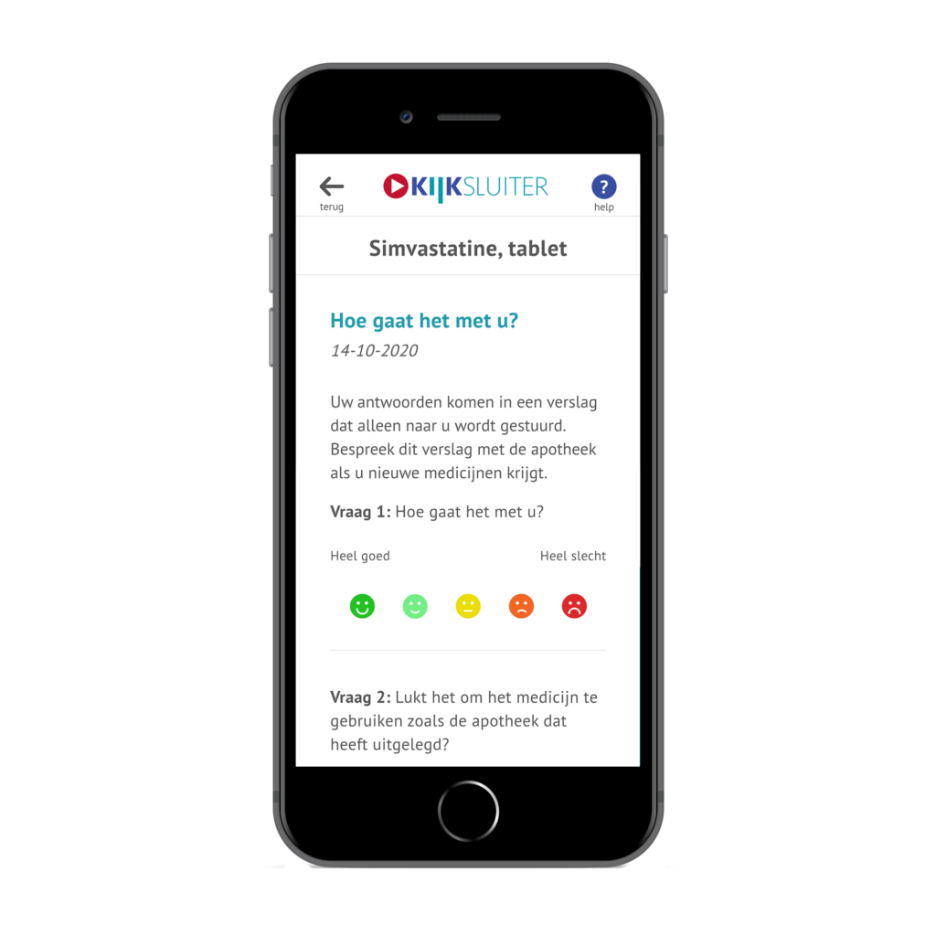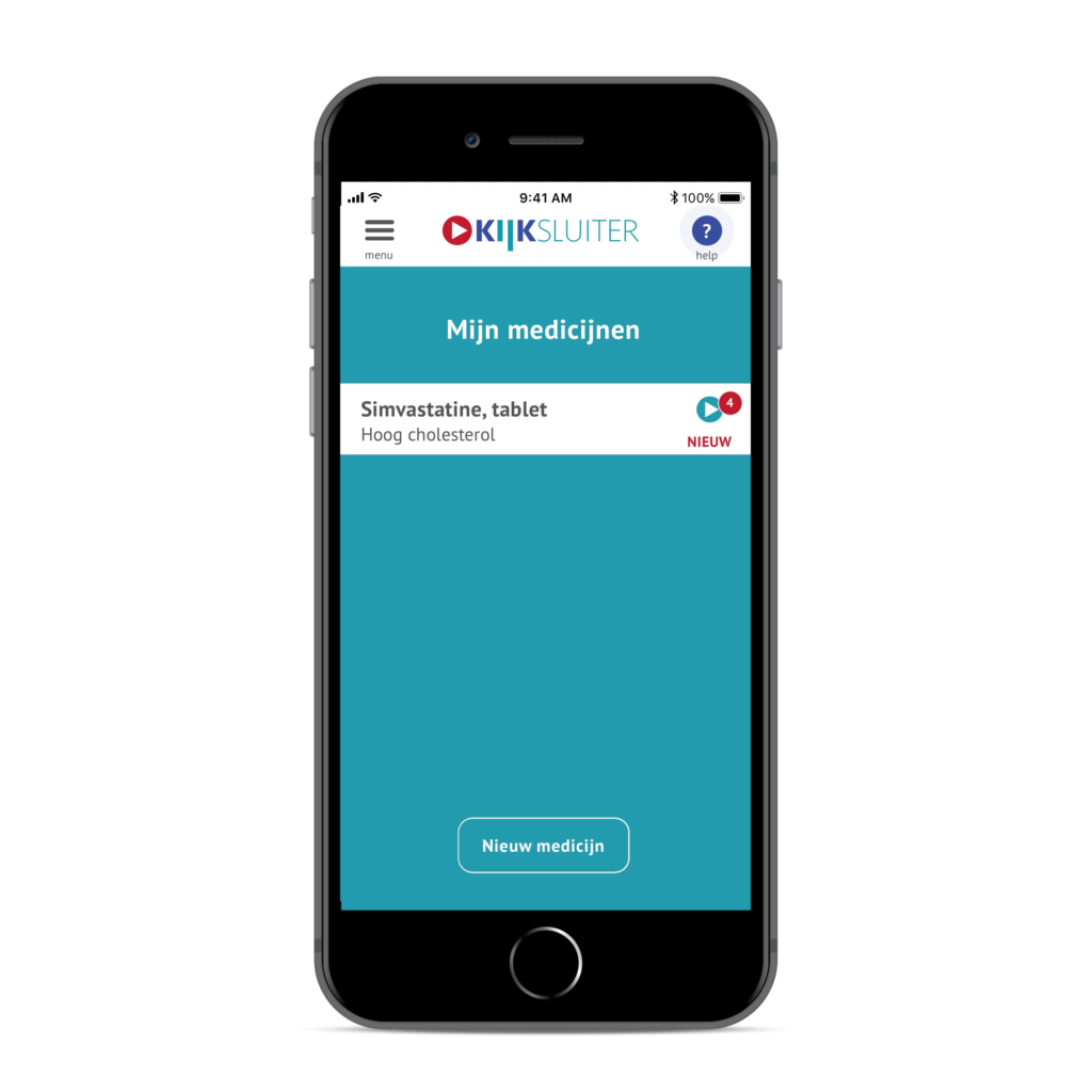 Bij het openen van KIJKsluiter (via e-mail of QR-code) krijgen patiënten een ‘dashboard’ met plaatjes te zien. Het dashboard toont alle beschikbare informatie voor het betreffende medicijn in de gekozen taal, waaronder de instructievideo. Patiënten bepalen zelf wat ze willen bekijken:
