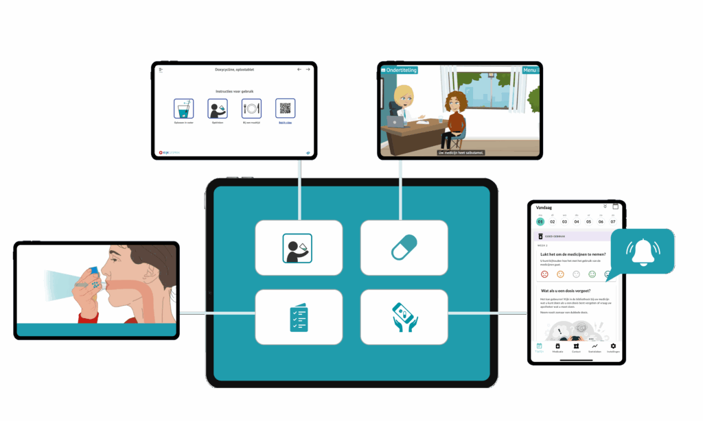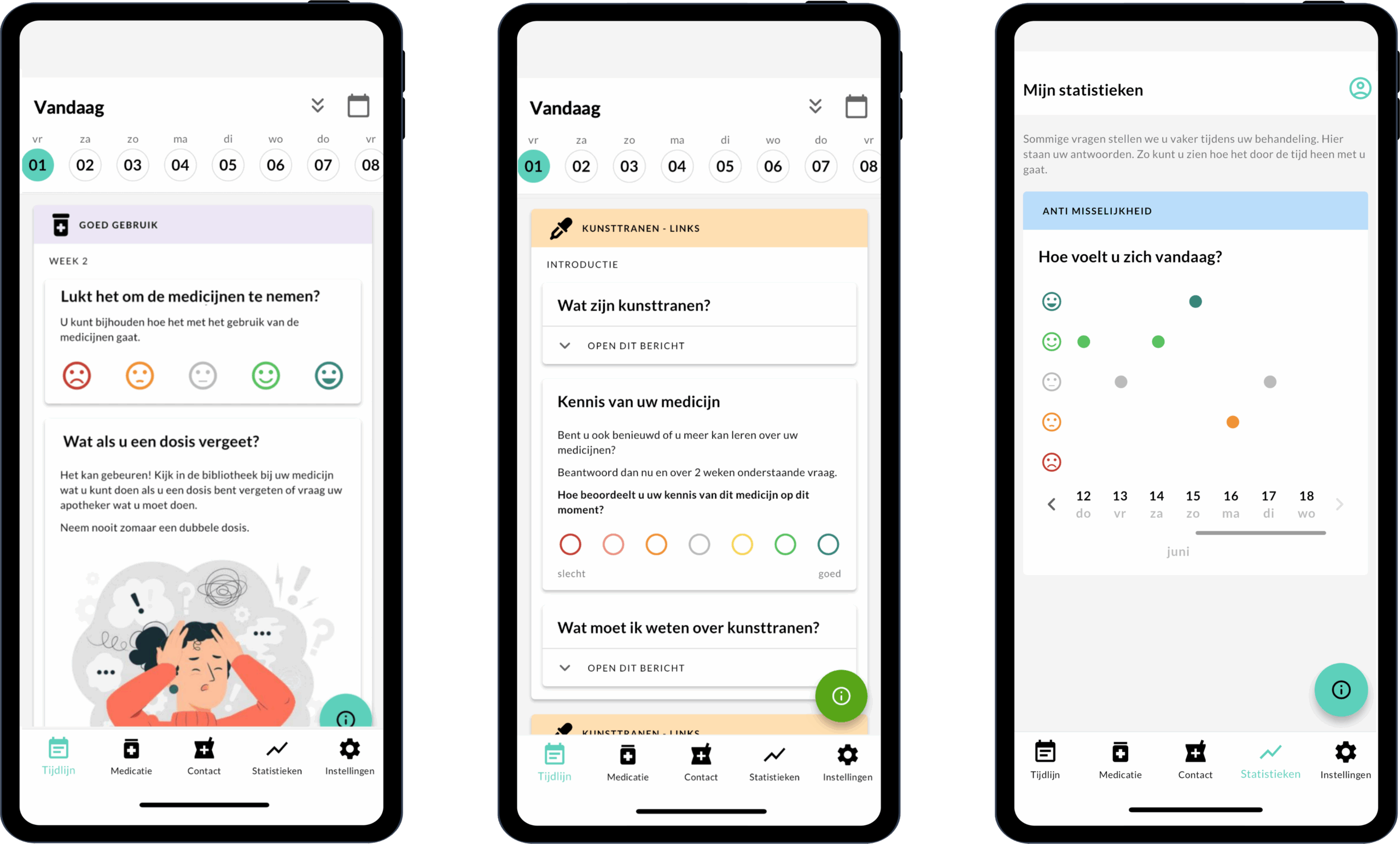 Stapsgewijze begeleiding via een app voor eerste en tweede uitgifte en therapietrouw ondersteuning bij chronische medicatie.
